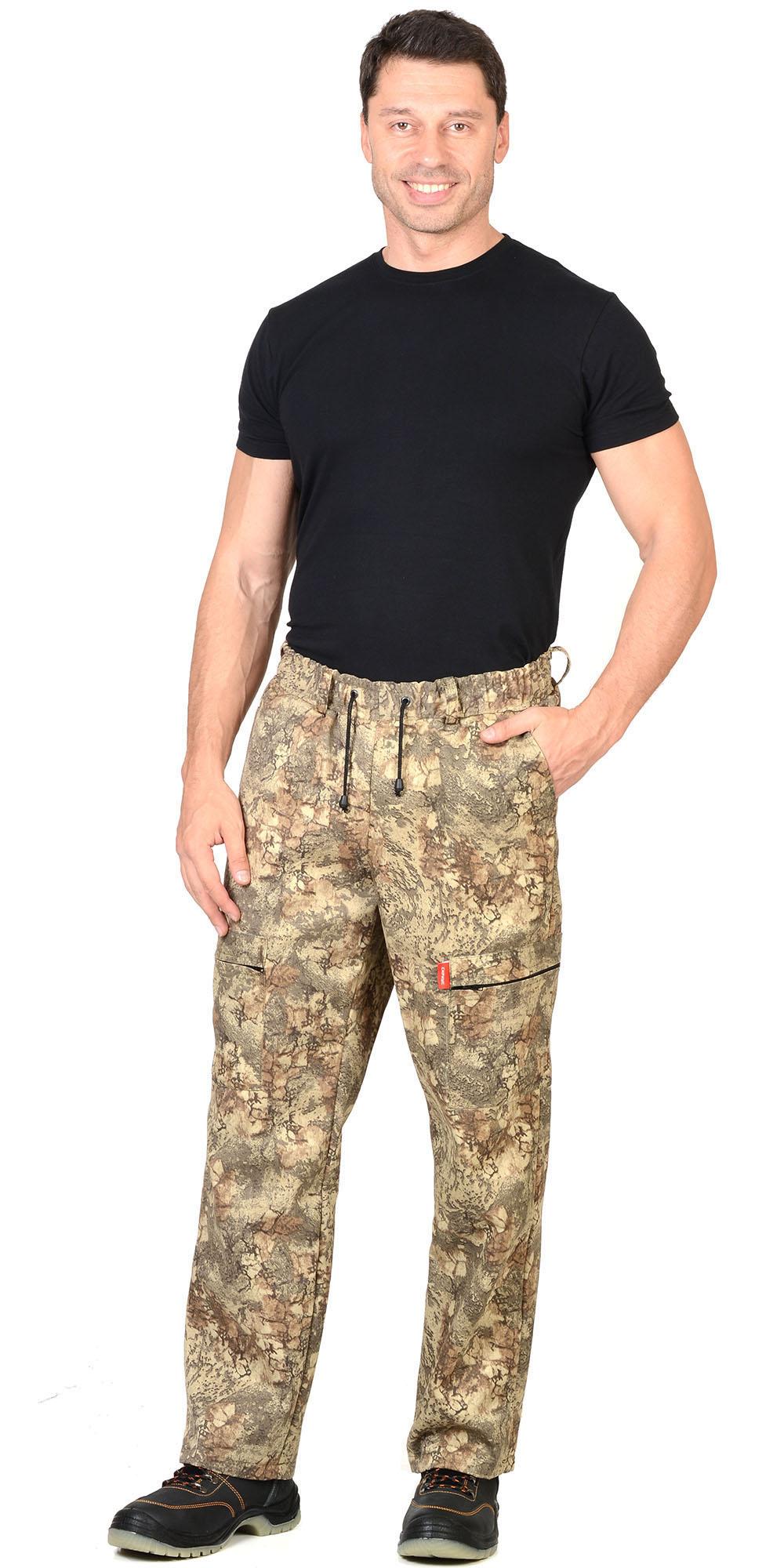 Брюки прямые; с притачным поясом, стянутым на эластичную тесьму; с пятью узкими шлевками на поясе; с карманами с наклонным входом на передних половинках; с накладными карманами на боковых швах застегивающиеся на тесьму - «молния»; с притачным широким поясом, стянутым эластичной тесьмой. В пояс брюк вставлен шнур, выведенный через блочки. Ткань: «CROWN» состав: 80% п/э 20% х/б, пл. 220г/м2 ГОСТ 12.4.280-2014