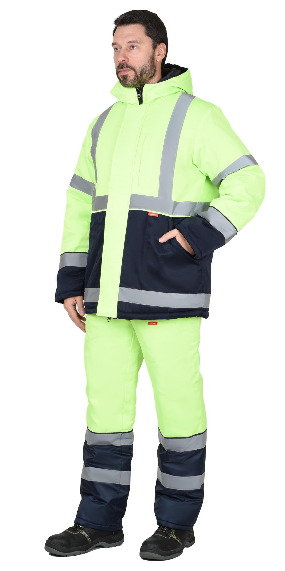 Куртка прямого силуэта; с притачной утеплённой стеганой подкладкой, с центральной застёжкой на двухзамковую тесьму - «молнию» и ветрозащитной планкой застегивающейся на потайные текстильные застежки «липучка» 4 шт., с втачным утепленным капюшоном. Рукава втачные. По полочкам, спинки в области груди, талии, низа и низа рукавов настрачивается СОП 50 мм для обозначения сигнальной видимости. Полукомбинезон прямой, с отрезной грудкой и спинкой, с центральной застёжкой на двухзамковую тесьму - «молния», с накладными боковыми карманами, с эластичной лентой по спинке, для лучшего прилегания. Бретели регулируются при помощи эластичной ленты и пряжек фастексов. Низ изделия выполнен из отделочной ткани. В полукомбинезоне используется СОП 50 мм для обозначения сигнальной видимости.