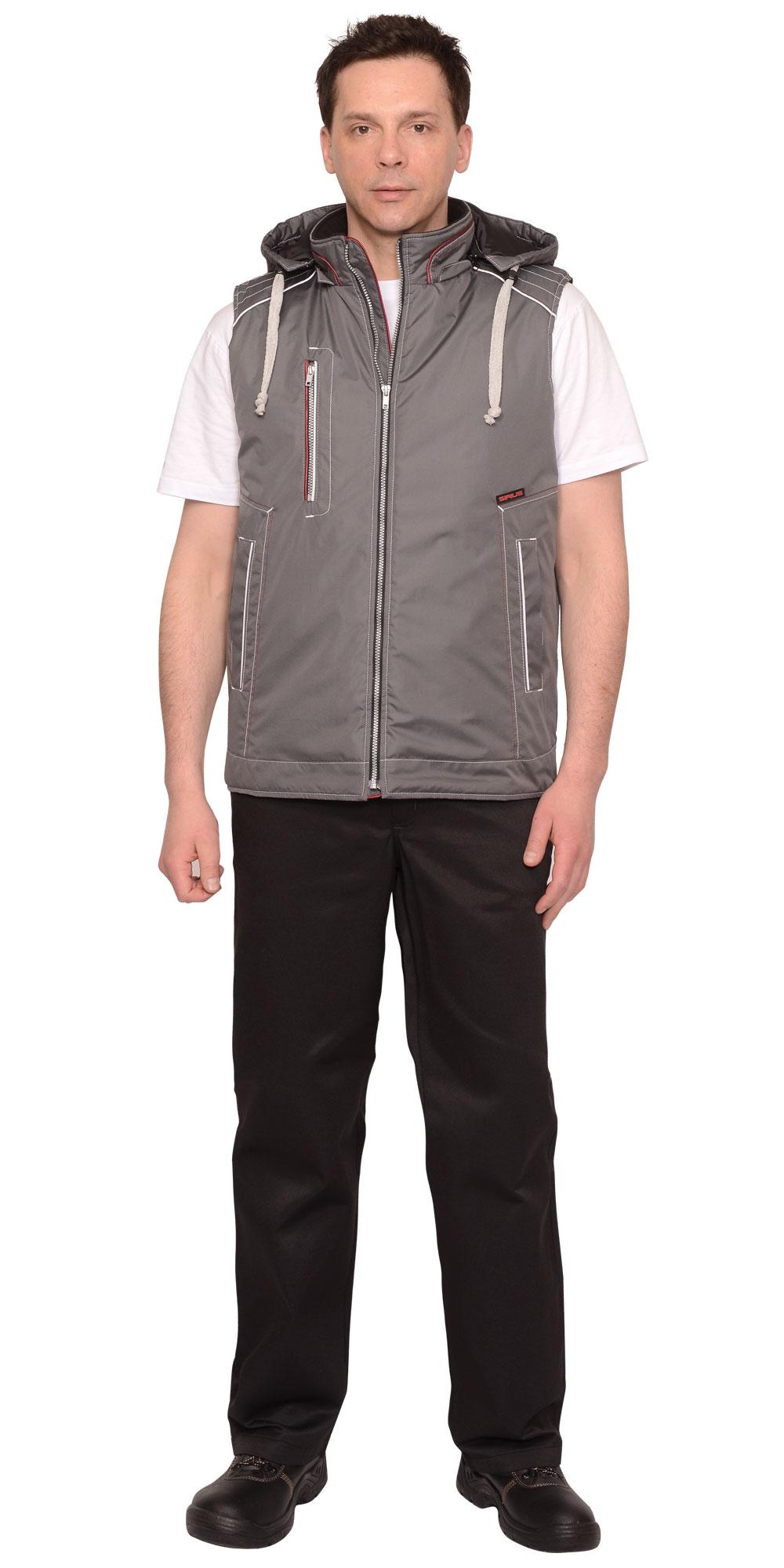 Жилет прямого силуэта утепленный с капюшоном, пристегивающимся на молнию; с застежкой до верха; воротник - стойка с отделочной деталью и кантом; полочка с двумя нижними прорезными карманами "листочка" и одним прорезным карманом "в рамку" на молнии (на правой полочке); на деталях жилета выполнены декоративные отделочные строчки серого и бордового цвета; с внутренней стороны на левой полочки расположен внутренний накладной карман на молнии; спинка удлинена.